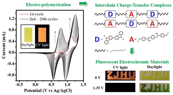 电致荧光变色(FEC)技术因其在离子传感器、信息显示、生物分析以及光学成像和信息存储等领域的潜在应用,受到科研工作者的广泛关注。聚合物FEC材料具有易修饰、可溶液加工、轻质、柔性等特点被认为是最有应用前景的新型功能材料之一。目前,获得聚合物FEC材料的方法主要通过缩聚、氧化聚合、 Heck偶联或Suzuki偶联等化学聚合,反应条件苛刻、操作复杂,且要经过进一步纯化和成膜等后续工序。电化学聚合(EP)是一种常温常压下就可简便操作的方法,可直接在导电基底上一步完成聚合与成膜过程,是制备导电聚合物薄膜的有效方法。然而,绝大部分荧光分子经过电化学聚合后由于结构缺陷或紧密的π-p堆积而导致荧光猝灭,从而失去FEC响应。因此,如何设计、构筑能够采用简便的电化学聚合法制备的FEC材料依然是该领域亟待解决的难题。