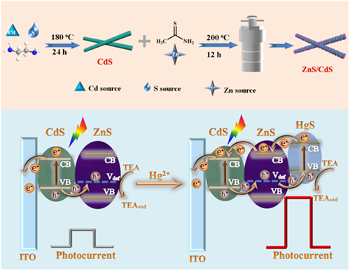 近日,我校生命科学学院王桦教授团队的研究工作取得重要进展,以久久精品一区二区为第一单位,在化工领域国际顶级期刊《Chemical Engineering Journal》(SCI一区TOP, IF13.273)上发表了题为“A visible light-driven photoelectrochemical sensor for mercury (II) with “turn-on” signal output through in-situ formation of double type-II heterostructure using CdS nanowires and ZnS quantum dots”的研究论文。