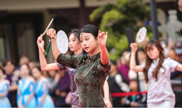 在《丝韵江南》的旗袍走秀中,十二位身穿旗袍的美丽姑娘手摇轻扇,漫步于江南水乡,演绎出东方女性的万种风情,令人陶醉。